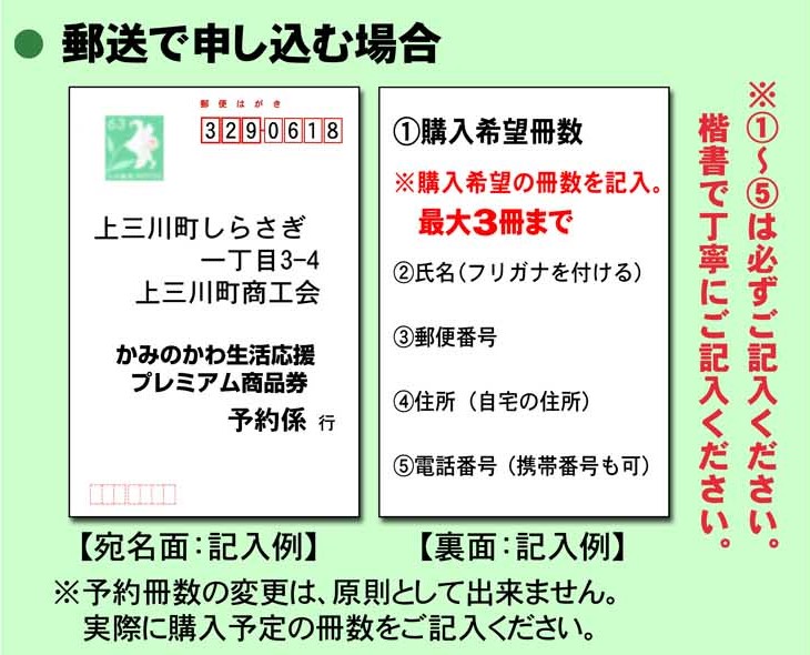 | 購入方法 | 後日引換券を郵送致します。 引換期間中に引換券と現金を持参し、上三川町商工会にて購入してください。 |